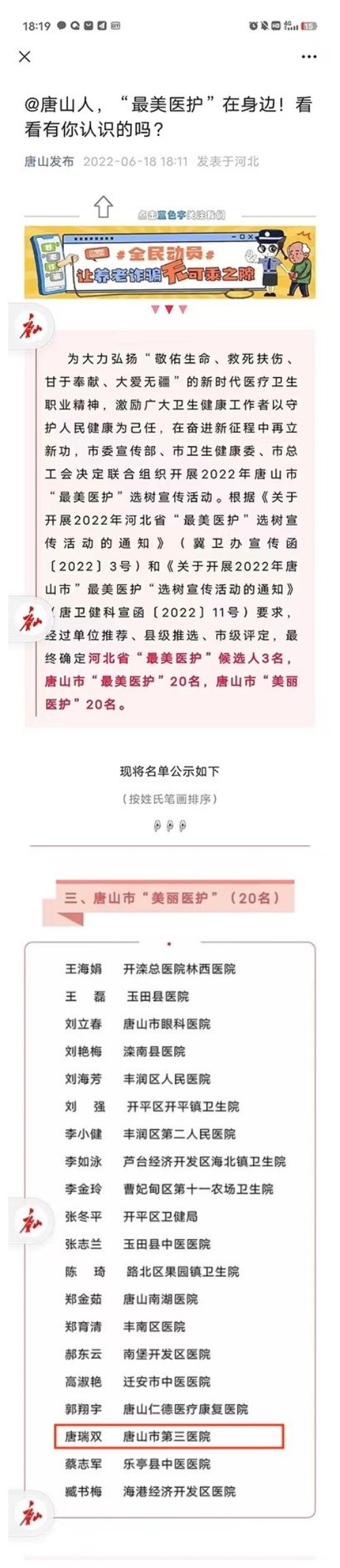 為大力弘揚“敬佑生命、救死扶傷、甘于奉獻、大愛無疆”的新時代醫療衛生職業精神,激勵廣大衛生健康工作者以守護人民健康為己任,在奮進新征程中再立新功,近日,唐山市委宣傳部、市衛生健康委、市總工會聯合組織開展2022年唐山市“最美醫護”選樹宣傳活動。經過單位推薦、縣級推選、市級評定,最終確定河北省“最美醫護”候選人3名,唐山市“最美醫護”20名,唐山市“美麗醫護”20名。唐山市農工黨黨員、市第三醫院心內科副主任唐瑞雙榮獲唐山市“美麗醫護”榮譽稱號。