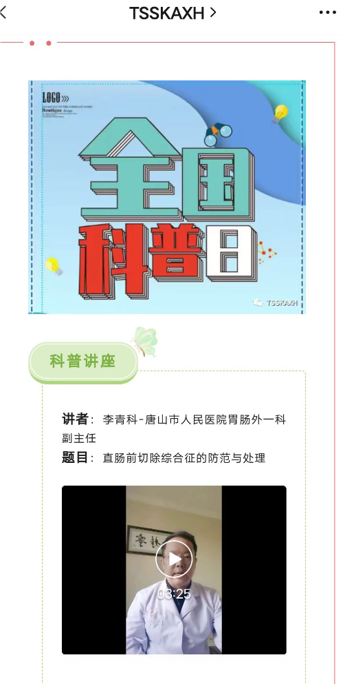 為積極響應“2022年全國科普日”活動要求,弘揚科學精神,普及健康知識,近日,唐山市農工黨黨員李青科圍繞“喜迎二十大、科普向未來”科普日主題,就“直腸前切除綜合征的防范與處理”專題錄制健康科普微講座視頻,通過微信公眾號網絡平臺發布,進行健康科普宣傳。