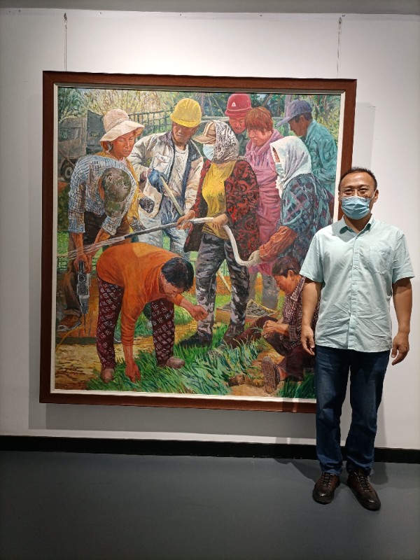 馬群作品《燃情花海》是一幅謳歌唐山花海建設者們頂烈日、撒汗水、愛勞動、繪豪情的后印象主義風格的油畫作品。畫面用濃度極高的紅和綠,藍和橙對比色,形成濃烈的補色關系,大面積的藍綠色彩對比烘托出勞動者火紅的臉、燃燒的情。馬群把唐山花海施工建設時搜集的人物素材,包括澆花、種草、運樹、注漿、木工等花海建設者的形象重新組合,用濃烈繽紛的油畫色彩描繪出花海建設者們燃情花海的建設場面,展現了唐山人民奮斗之力、創造之力、發展之果,傳遞出農工黨黨員心系家國的赤子情懷,“永遠跟黨走”的政治信念和獻禮中共二十大、農工黨十七大的喜悅之情。