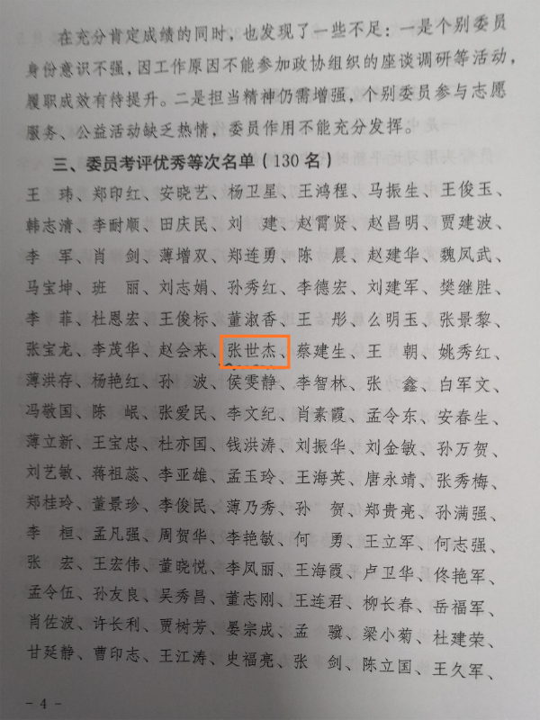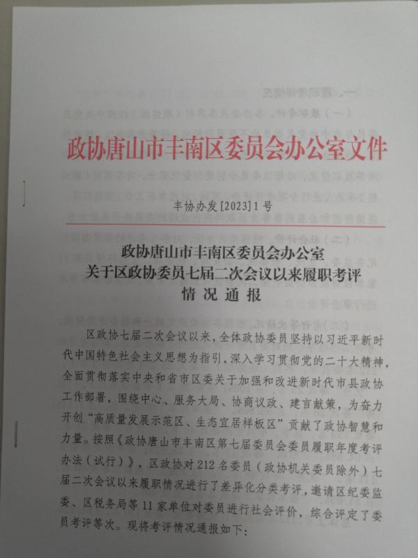 2023年1月6日,中國人民政治協商會議唐山市豐南區第七屆委員會第三次會議隆重召開。會前,區政協就七屆二次會議以來委員履職考評情況進行通報,農工黨唐山市豐南區支部主任張世杰榮獲“優秀委員”榮譽稱號。