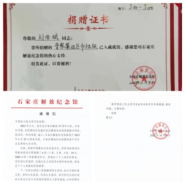 2023年10月9日上午,農工黨省委委員、文史理論專委會副主任劉浩斌專程趕到石家莊解放紀念館,將收藏多年的6件珍貴的晉察冀邊區幣無償捐贈給紀念館。