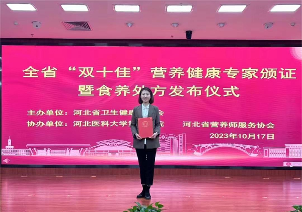 為進(jìn)一步深入推進(jìn)健康知識(shí)普及行動(dòng),不斷提高全省居民健康素養(yǎng),10月17日上午,河北省衛(wèi)生健康委員會(huì)在石家莊舉辦2023年度全省“雙十佳”營(yíng)養(yǎng)健康專(zhuān)家頒證暨食養(yǎng)處方發(fā)布會(huì),對(duì)在全省范圍內(nèi)評(píng)選出的10名“知名營(yíng)養(yǎng)健康專(zhuān)家”、10名“十佳營(yíng)養(yǎng)健康科普專(zhuān)家”進(jìn)行表彰。唐山市農(nóng)工黨黨員、市健康管理師協(xié)會(huì)副會(huì)長(zhǎng)兼秘書(shū)長(zhǎng)、國(guó)家一級(jí)健康管理師朱華榮獲河北省“十佳營(yíng)養(yǎng)健康科普專(zhuān)家”。