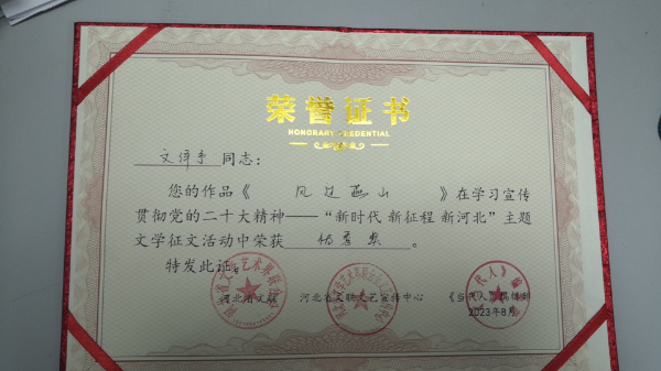 日前,由河北省文聯主辦,河北省文聯文藝宣傳中心《當代人》編輯部承辦的學習宣傳貫徹黨的二十大精神——“新時代 新征程 新河北”主題文學征文評審工作結束。經過評委會嚴格評審,在821篇來稿中遴選出獲獎作品46件。其中一等獎3件、二等獎6件、三等獎9件、優秀獎28件。農工黨唐山市豐南區支部副主任王雪松的組詩作品《風過燕山》榮獲優秀獎,作品收錄《新時代 新征程 新河北 主題文學征文獲獎作品集》。