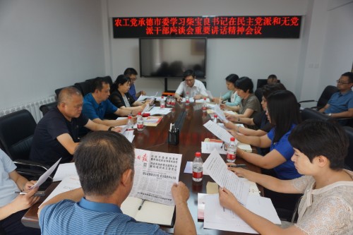 7月15日,農工黨承德市委召開市委擴大會議,深入學習柴寶良書記在民主黨派和無黨派干部座談會上的重要講話精神。承德市政協副主席、農工黨承德市委主委郭靖濤主持會議,專職副主委谷雪芬、副主委姜皚豐、高宇、李葵花,秘書長李向寶出席會議。