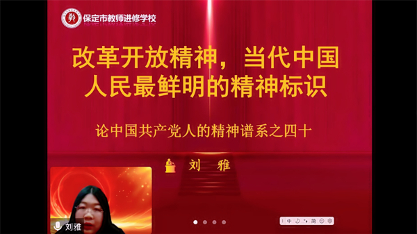 農(nóng)工黨保定同心書院副秘書長、市職業(yè)教育支委會副主委、保定市教師進修學校法工部部長劉雅領學《改革開放精神,當代中國人民最鮮明的精神標識——論中國共產(chǎn)黨人的精神譜系之四十三》,從頂層設計、改革、開放、結語四部分,結合農(nóng)村經(jīng)濟體制改革、國企改革、對外開放大事記等,闡釋改革開放的精神實質和豐富內涵,講述改革開放的主要成就和經(jīng)驗啟示。