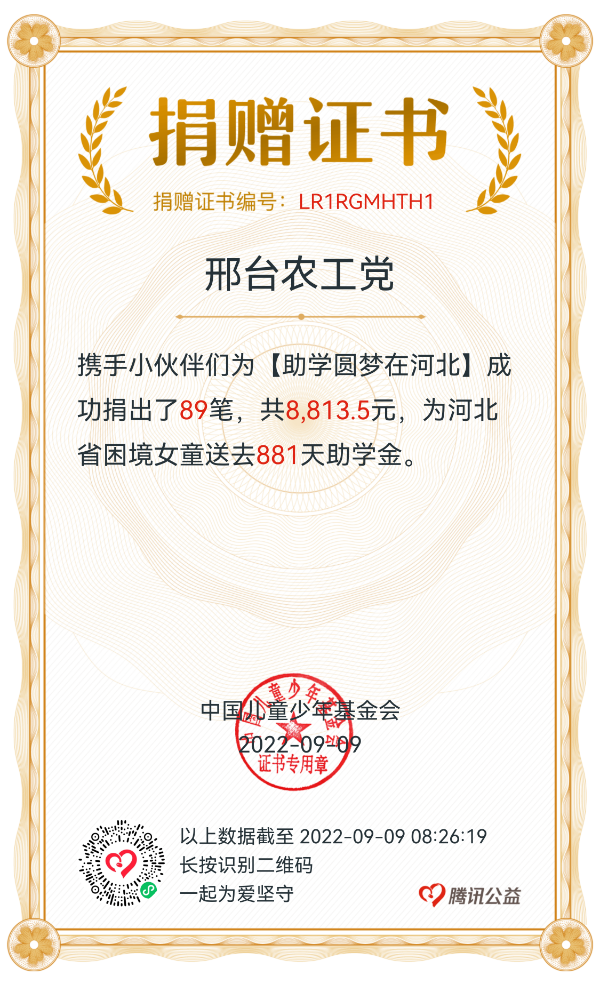 “助學圓夢”愛心募捐活動。為幫助貧困學生實現大學夢,農工黨邢臺市委積極開展“99公益日 助學圓夢”愛心募捐活動。全市黨員積極參與募捐活動,89名黨員共募捐8813元助學金,為貧困學生籌集了881天助學金。