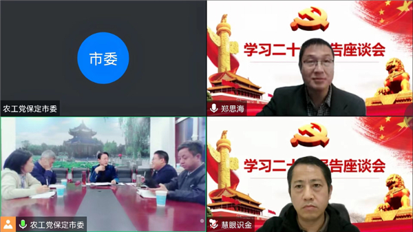 10月17日,農工黨保定市委召開理論學習中心組學習會議,專題學習中共二十大精神。農工黨河北省委副主委、保定市委主委,保定市人民政府副市長楊偉坤出席會議。農工黨保定市委專職副主委趙濤,副主委劉風昌、趙寶輝,副秘書長楊森,機關干部劉玉陽、代偉超在黨派機關會議室參加會議。副主委鄭思海、市委委員金星通過騰訊會議線上參會。