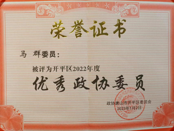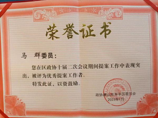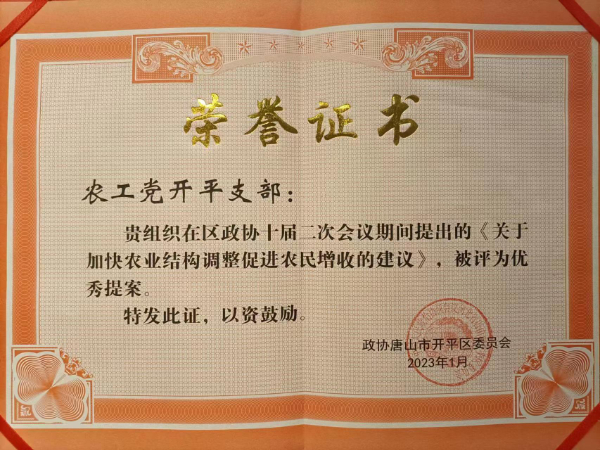 1月4日,中國(guó)人民政治協(xié)商會(huì)議唐山市開(kāi)平區(qū)第十屆委員會(huì)第三次會(huì)議隆重召開(kāi)。會(huì)上,農(nóng)工黨唐山市開(kāi)平區(qū)支部榮獲區(qū)政協(xié)多項(xiàng)表彰,其中,開(kāi)平區(qū)支部報(bào)送的《關(guān)于加快農(nóng)業(yè)結(jié)構(gòu)調(diào)整促進(jìn)農(nóng)民增收》的提案被評(píng)為優(yōu)秀提案,支部主任馬群被評(píng)為優(yōu)秀提案工作者、優(yōu)秀政協(xié)委員。