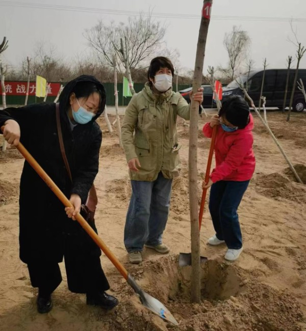 在廣陽區(qū)九州鎮(zhèn)南漢村植樹現(xiàn)場,大家三人一組,揮鍬鏟土、扶苗固根、培土夯實、提水澆灌......各個環(huán)節(jié)配合默契,干勁十足。和煦的春風中,一排排樹苗錯落有致、迎風而立,形成一片美麗的“同心林”。