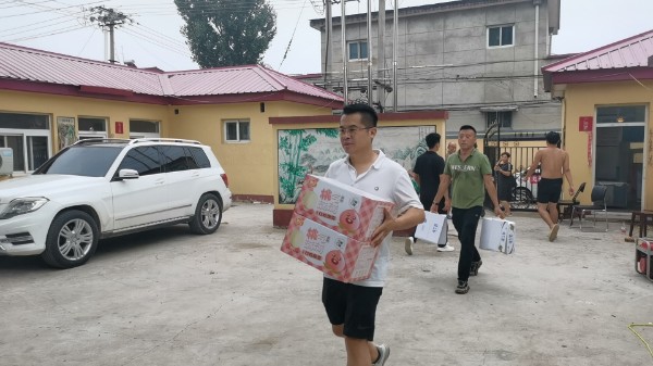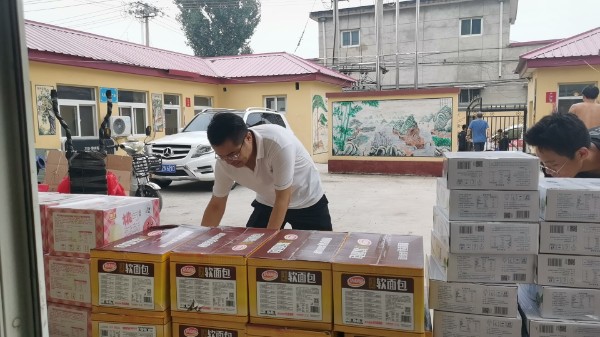 農工黨蓮池支委會副主委、愛心企業家、保定市華仁皮膚病醫院院長閆景仲出資為百尺竿鎮馮村村委會的受災群眾捐助價值2500元的礦泉水、面包、牛奶等物資。