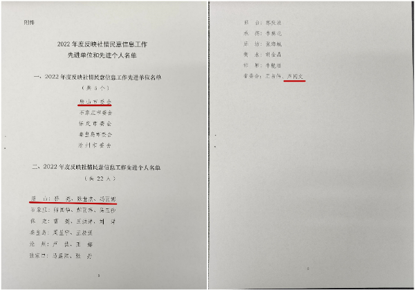 農工黨唐山市委會分別以排名第一的成績榮獲參政議政工作先進單位、社情民意信息工作先進單位。黨員劉曉明榮獲參政議政工作先進個人,黨員蘆閱文、張世杰、孫亮、馮麗娜榮獲社情民意信息工作先進個人。