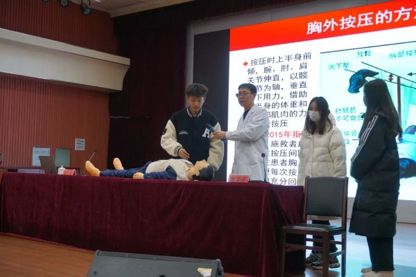 保定市第一中心醫院急診科副主任醫師梁青詳細講解了心肺復蘇相關理論知識和技能,并利用模型手把手指導師生進行心肺復蘇術急救操作。