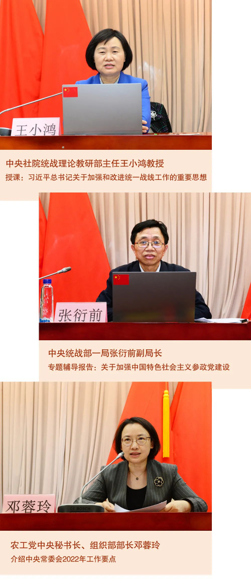 培訓(xùn)班邀請了中央社院統(tǒng)戰(zhàn)理論教研部主任王小鴻教授,中央統(tǒng)戰(zhàn)部一局張衍前副局長分別就習(xí)近平總書記關(guān)于加強(qiáng)和改進(jìn)統(tǒng)一戰(zhàn)線工作的重要思想、關(guān)于加強(qiáng)中國特色社會主義參政黨建設(shè)進(jìn)行授課和專題輔導(dǎo)報(bào)告。農(nóng)工黨中央秘書長、組織部部長鄧蓉玲介紹中央常委會2022年工作要點(diǎn)。