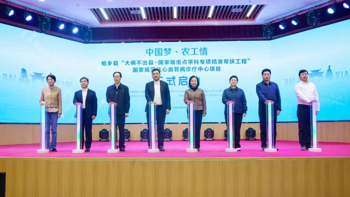 與會領導共同上臺啟動按鈕,宣布柏鄉縣“大病不出縣”國家規范化心血管病診療中心項目正式啟動。